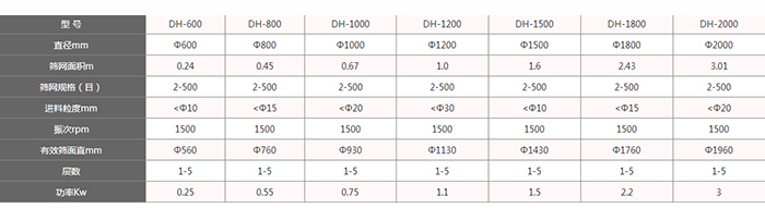 不銹鋼旋振篩分機(jī)型號有:DH-400mm、DH-600mm、DH-800mm、DH-1000mm、DH-1200mm、DH-1500mm、DH-1800mm、DH-2000mm等八種標(biāo)準(zhǔn)型號。(可以按照用戶的需求進(jìn)行特殊型號定制)