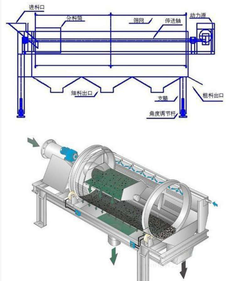 滾筒篩砂機主要是由動力組件、粗料出料口、上密封殼、篩筒、篩下物出料口、擋料板、進料口、支架等部分組成的。滾筒篩通過變速減速系統(tǒng)使篩分筒在一定轉(zhuǎn)速下旋轉(zhuǎn),其分級級數(shù)一般從細到粗為1-4節(jié),物料自上而下通過篩分筒得到粉粒,細料從篩分筒前端下部排出,粗料從篩分筒下端尾部排出,實現(xiàn)物料分級目的。